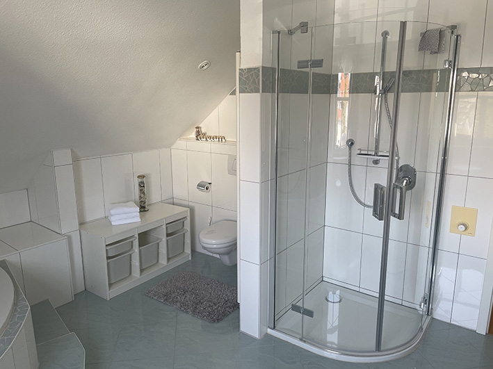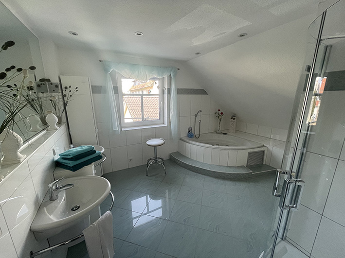 - Großes, helles Badezimmer mit Dusche, WC, Wellnessbadewanne, Föhn